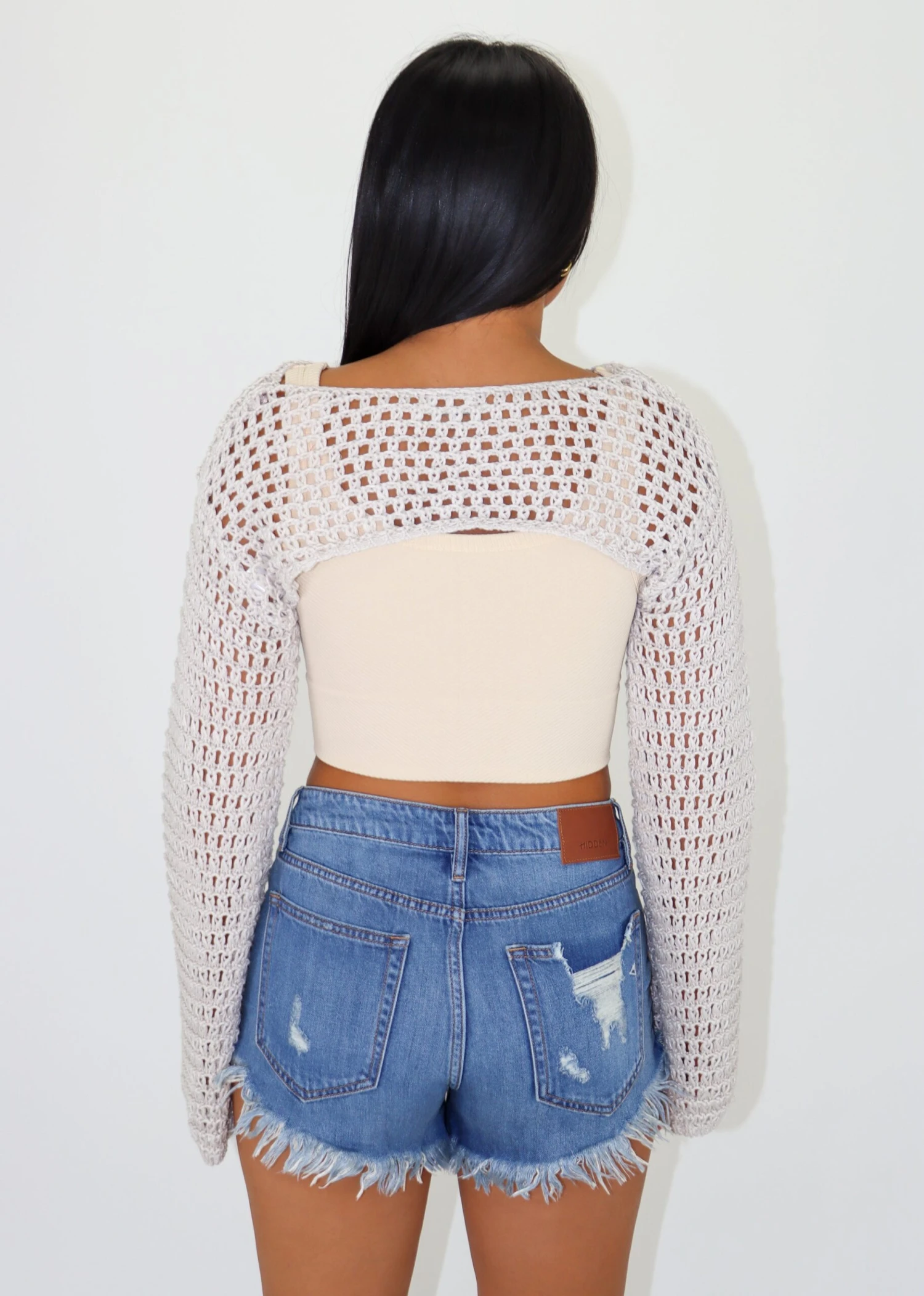 You will need this bolero sweater in your closet! This bolero sweater features a crochet knit material that is perfect to spice up any outfit this summer.