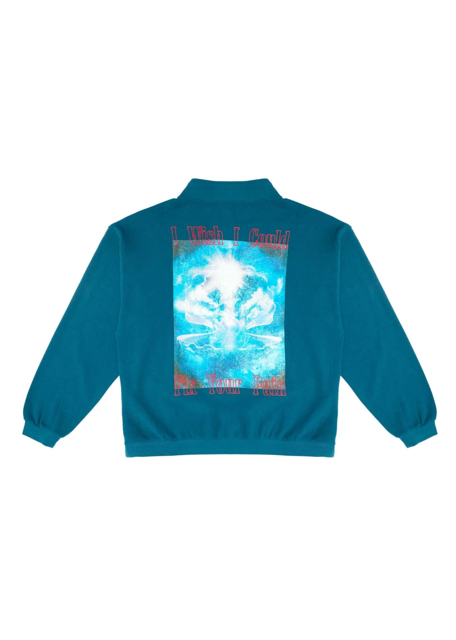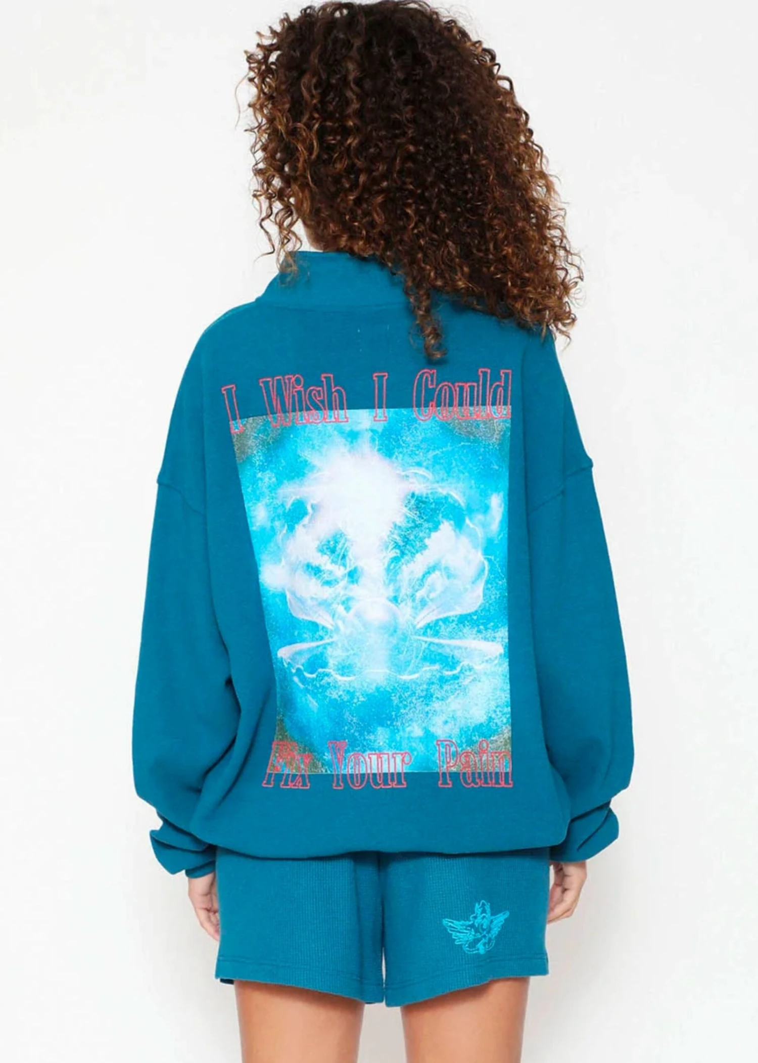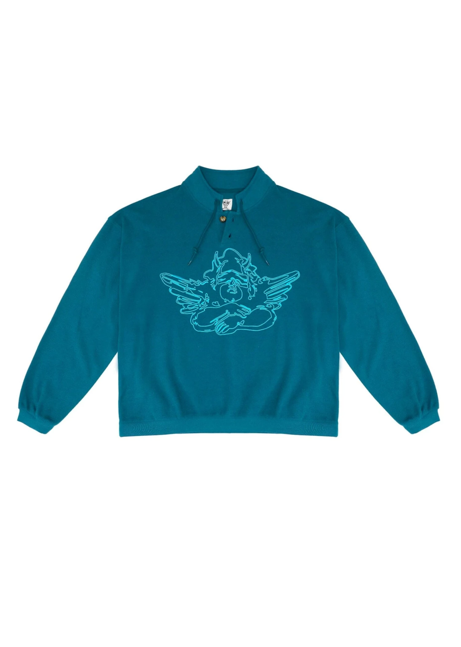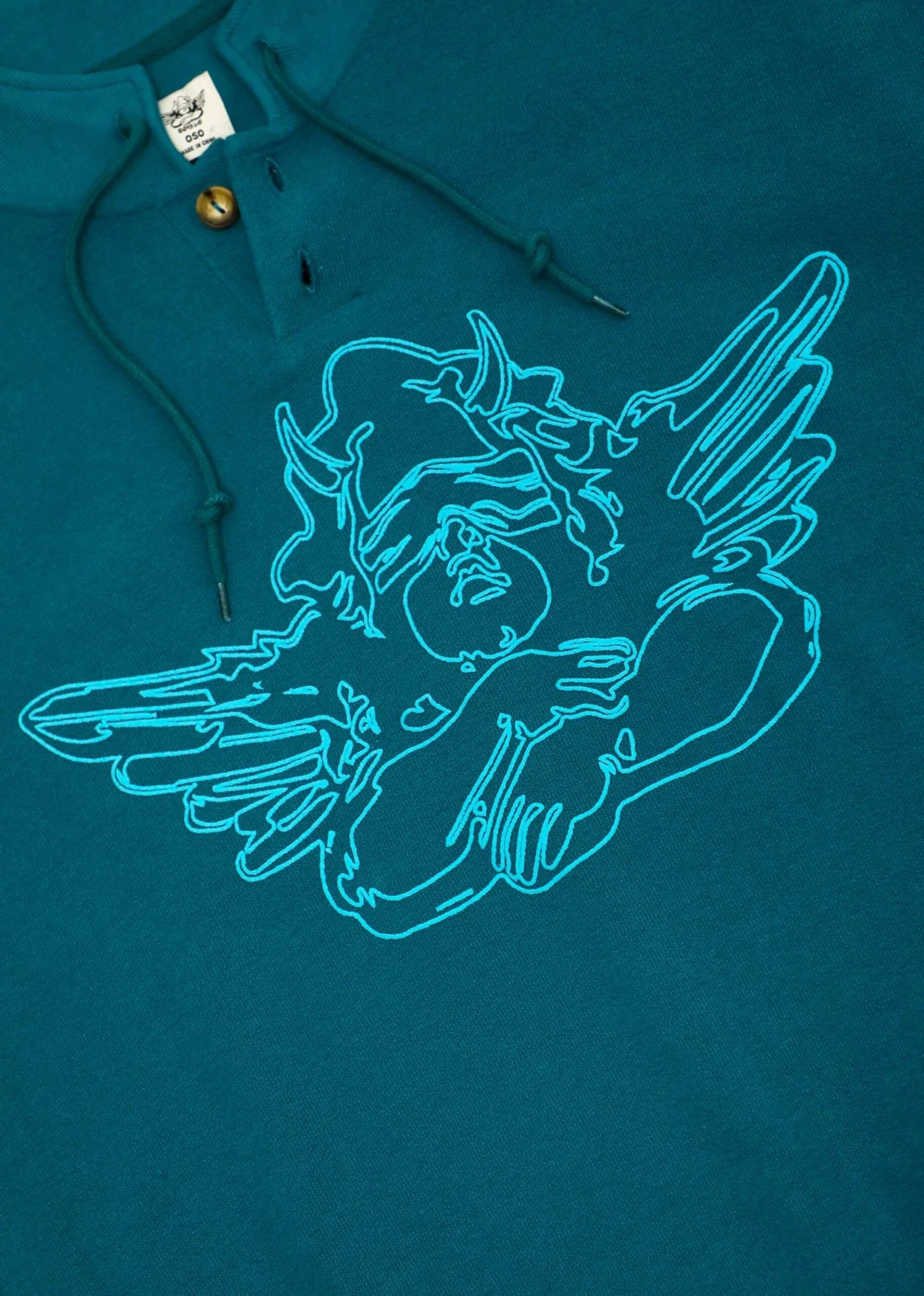 Inside out french terry fabric in teal. Henley style crewneck with button details, drawstring, and ribbed cuffs and hem.