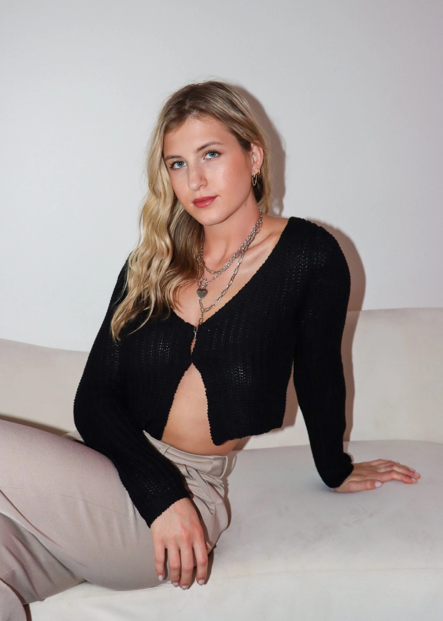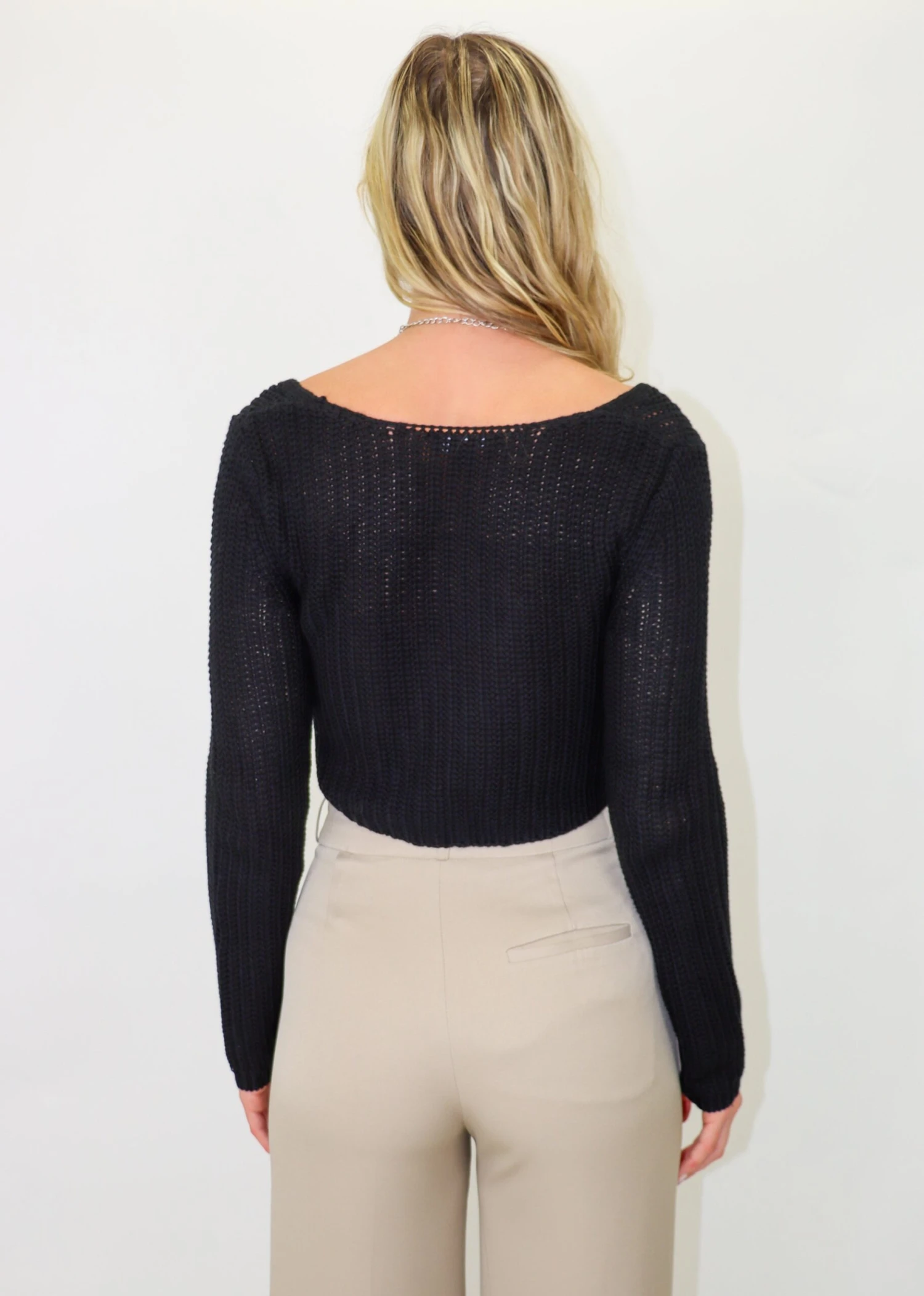 This black hook and eye knitted sweater is a closet necessity! We love the fit of it and how versatile it is as well. Pair it with a mini skirt and knee high boots for a stylish look!