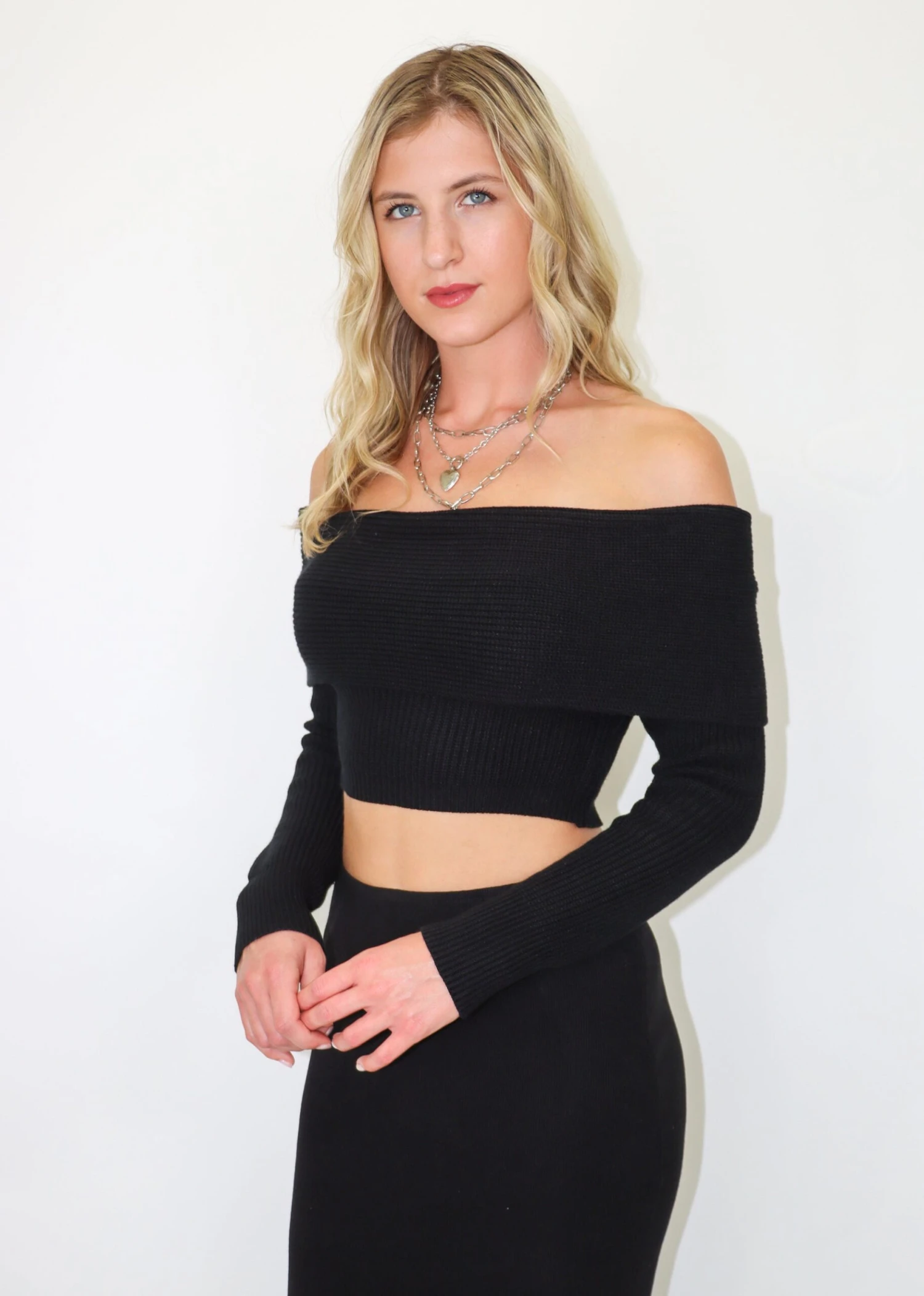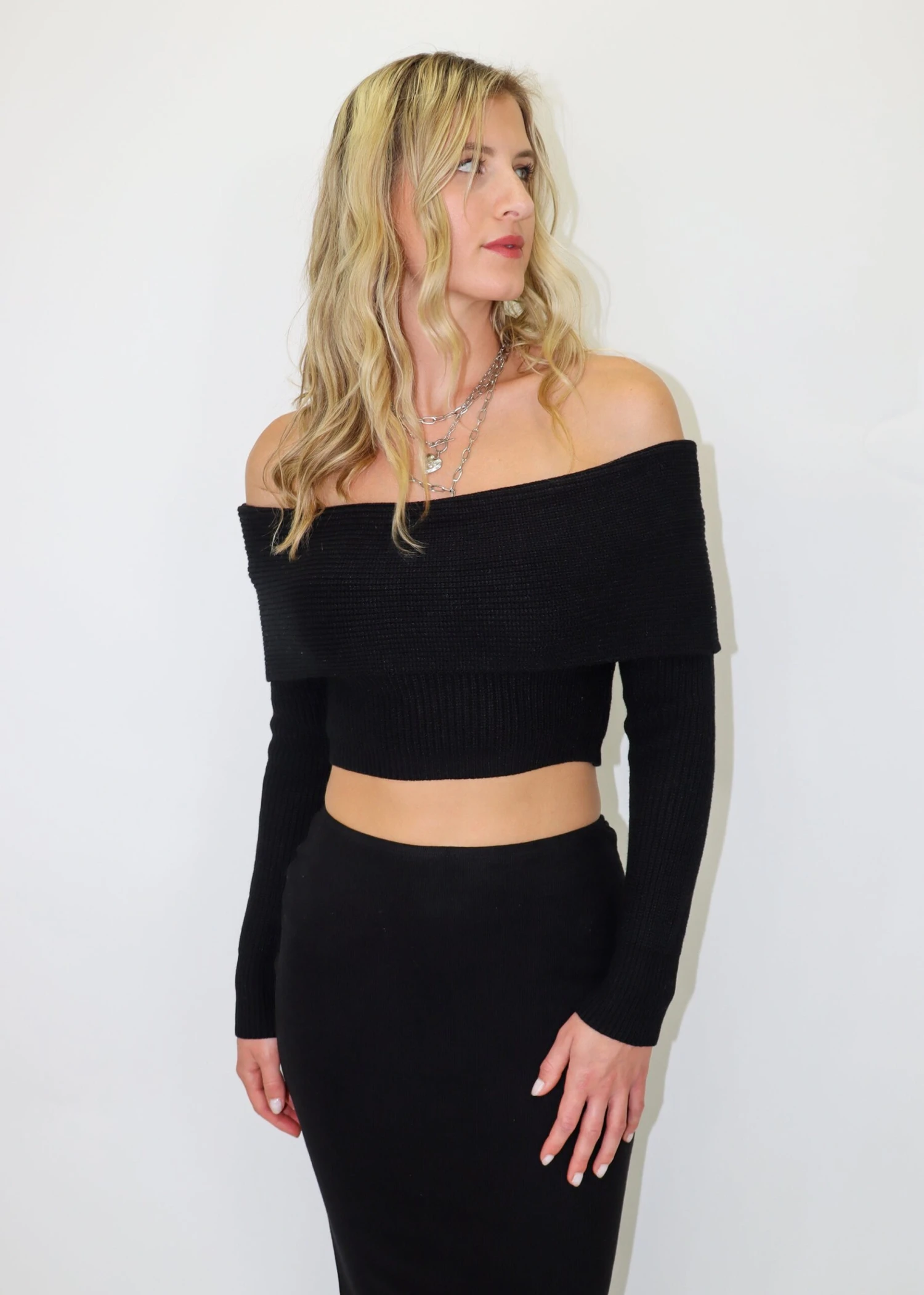 This black cropped sweater is a closet staple you need in your life! It features an off the shoulder look which will spice up any outfit. Style this with a mini skirt and knee high boots for the perfect going out look!