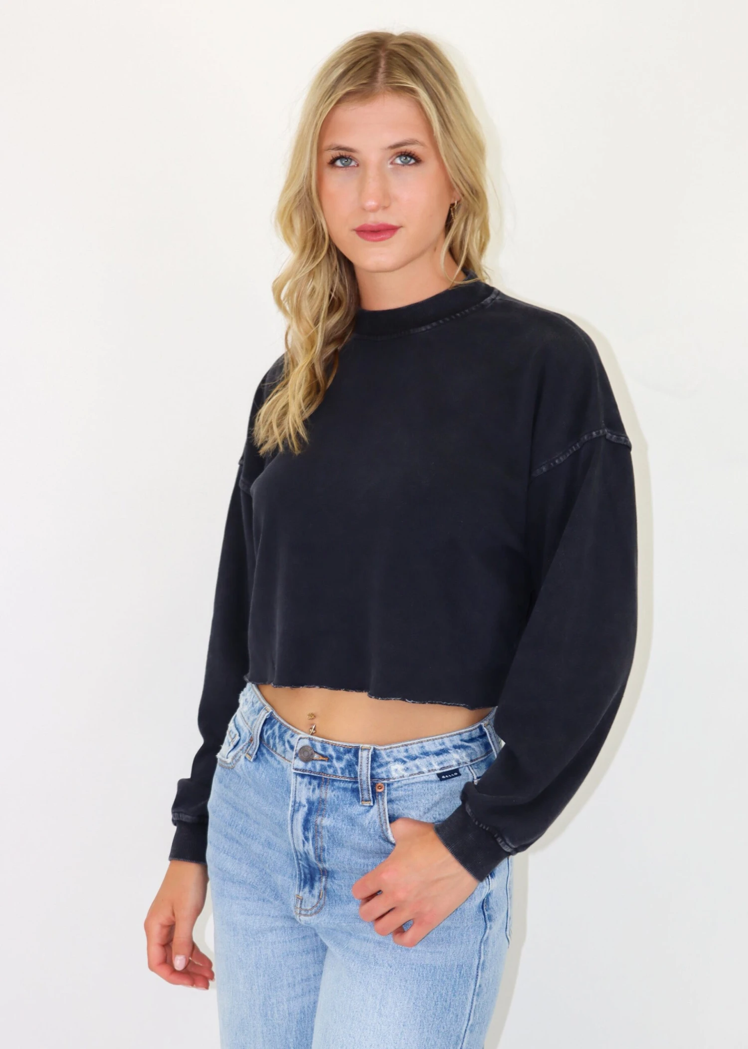 This cropped vintage gray long sleeve is a must have! Featuring a cropped loose fit, pair this with your favorite jeans for a cute everyday look or style with a skirt for a going out look!