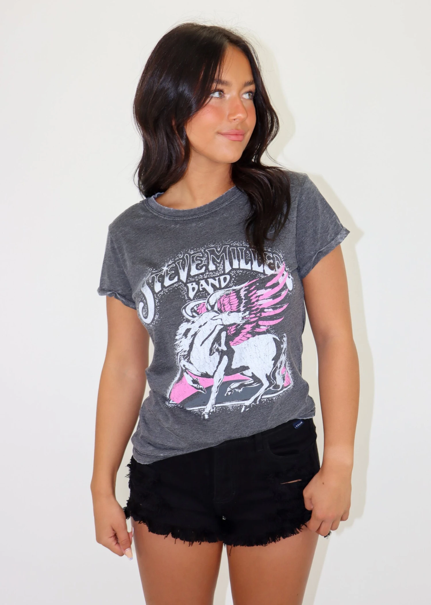 We are loving band graphic tees! This Steve Miller band tee features their classic horse logo on the front with rolled sleeves and burnout material.