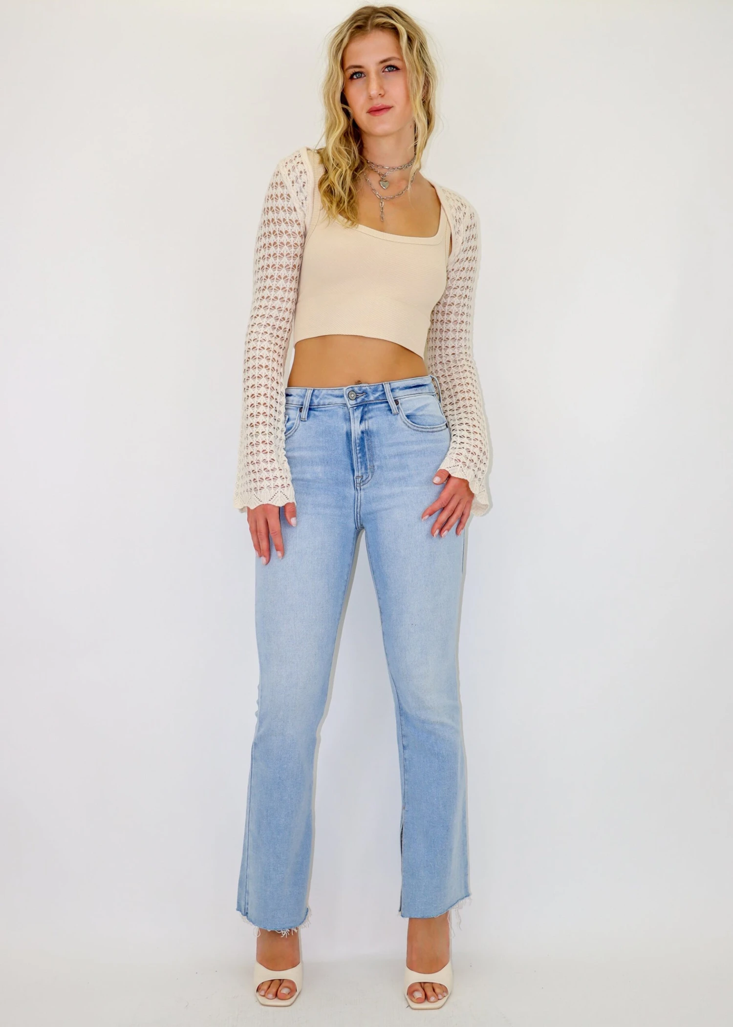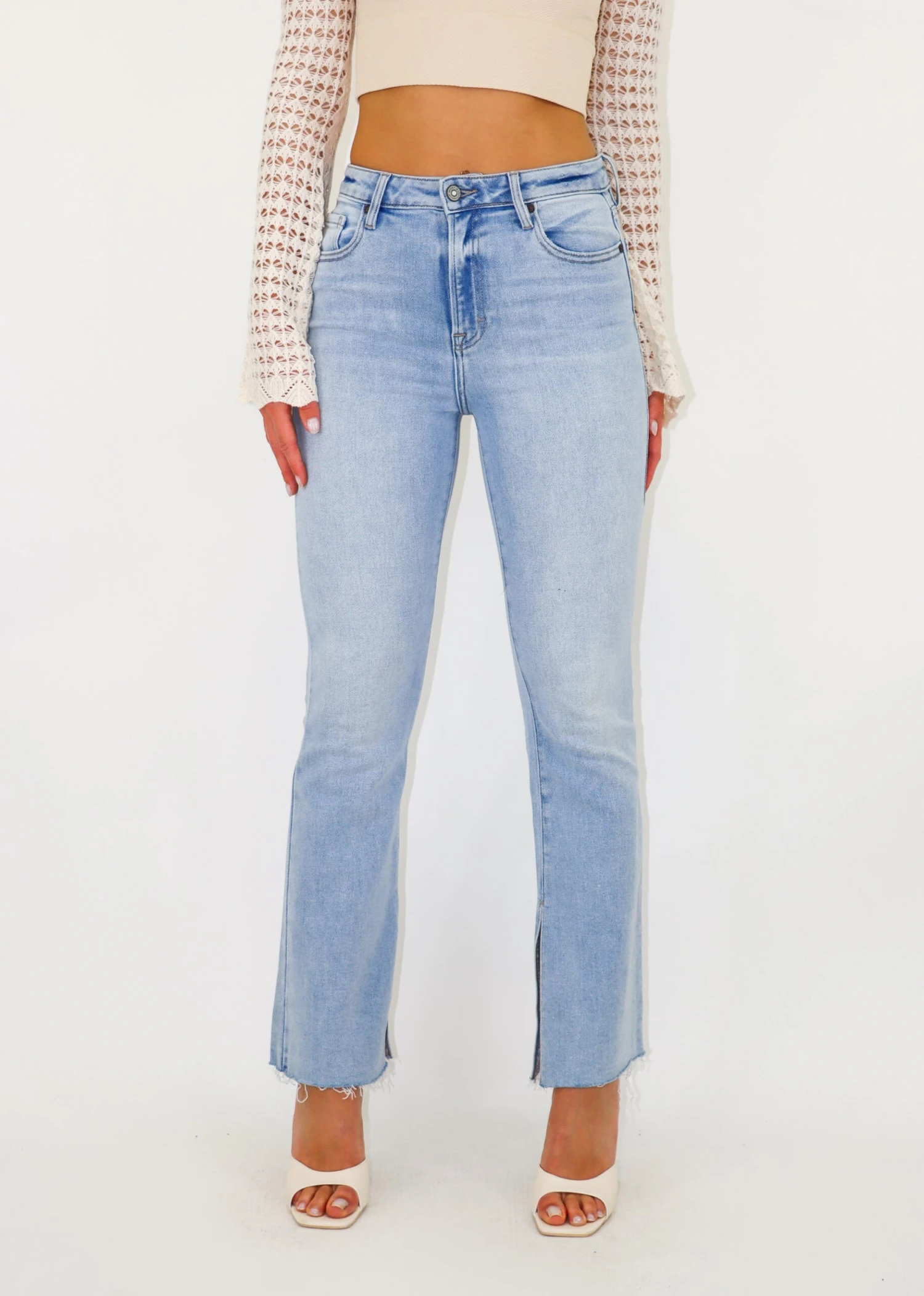 These light wash jeans feature a slit hem and a high waisted fit. Pair these with any top for all occasions and seasons.
