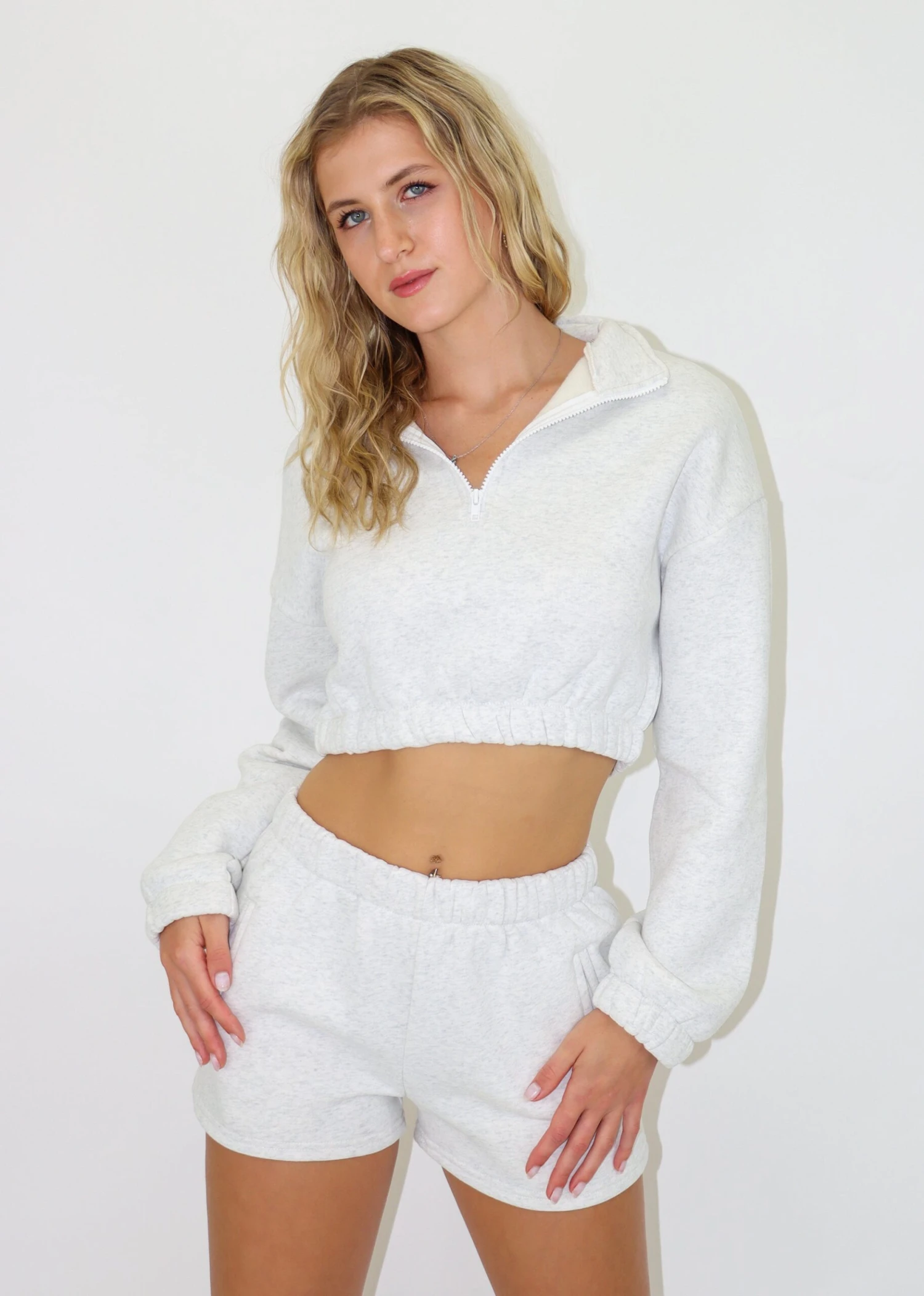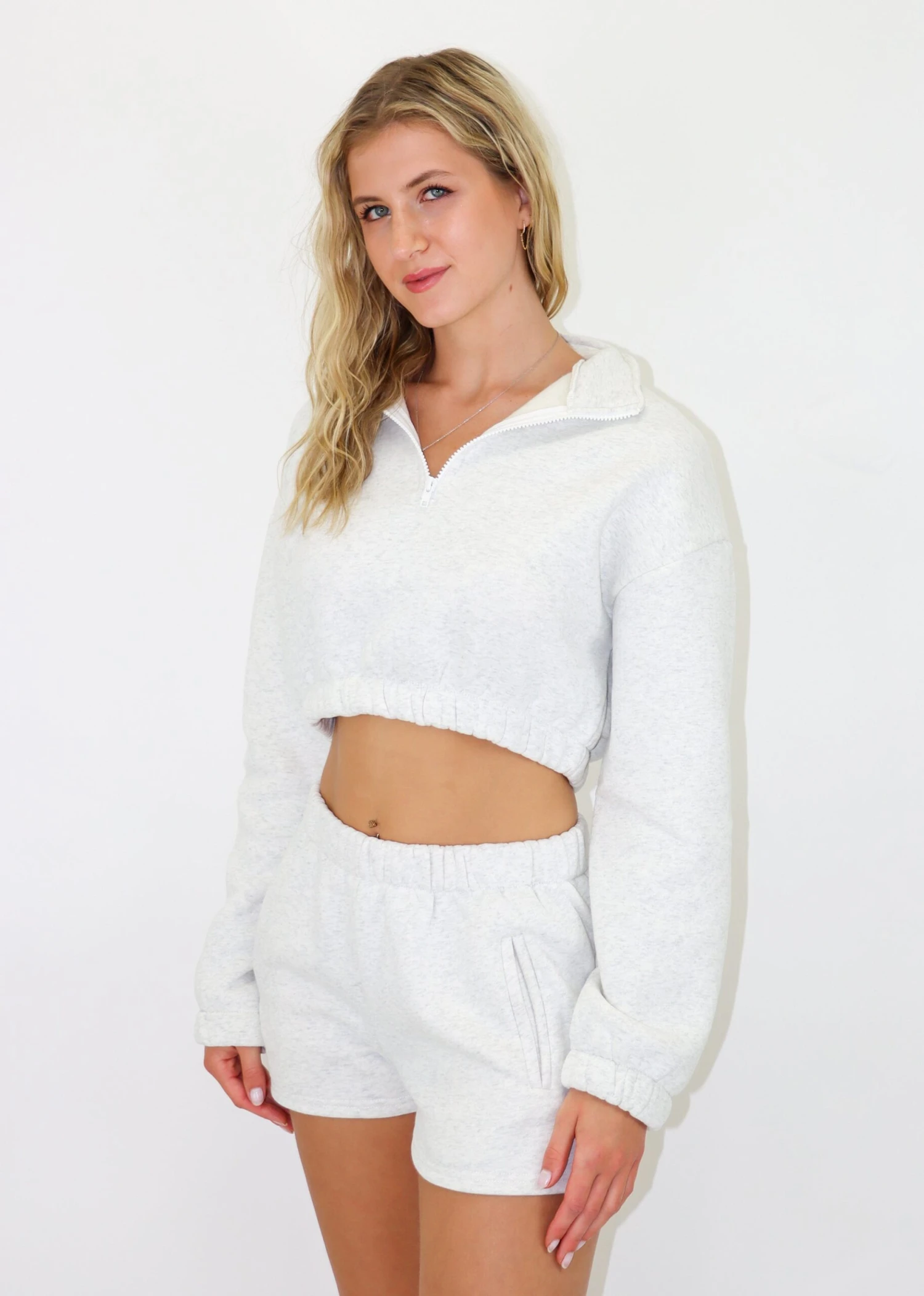 Wear this grey sweatshirt to class or to lounge around. Style it with leggings, shorts, or the matching bottoms.