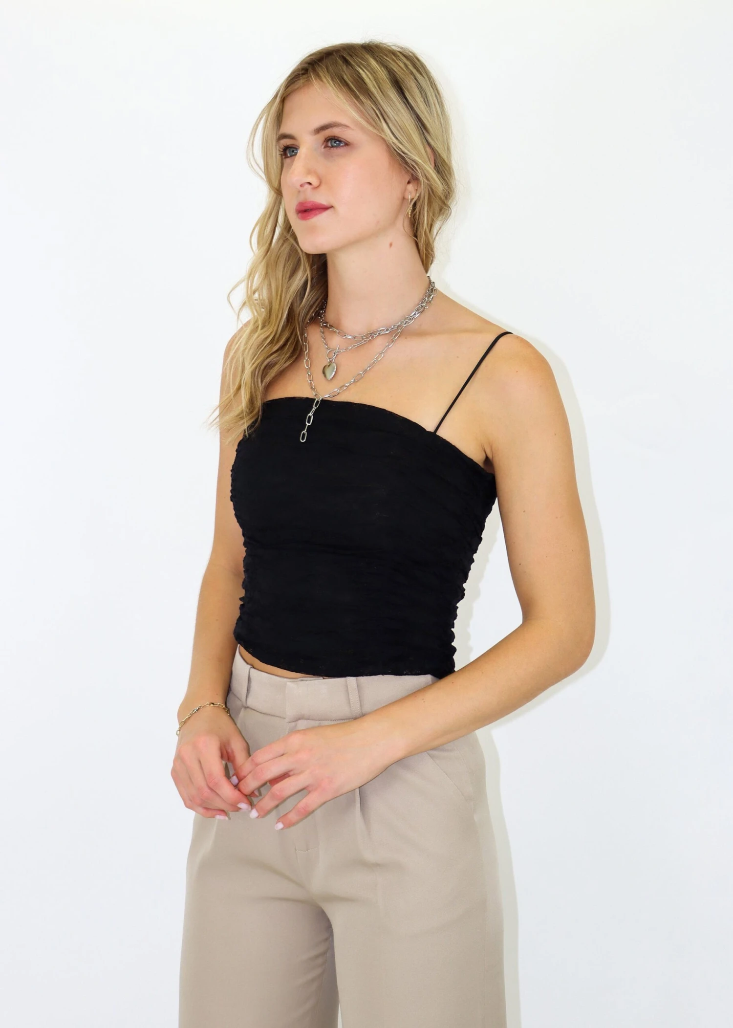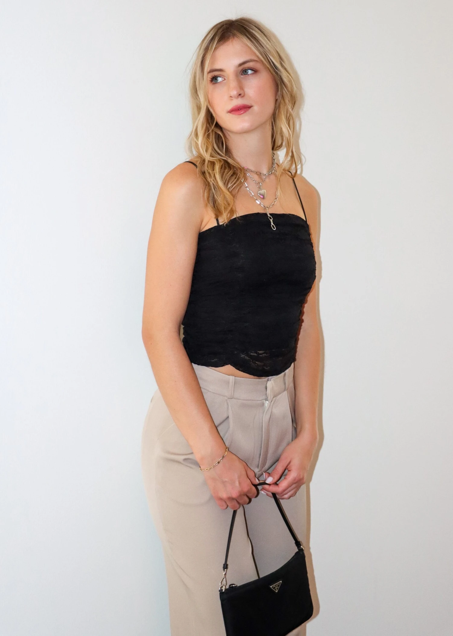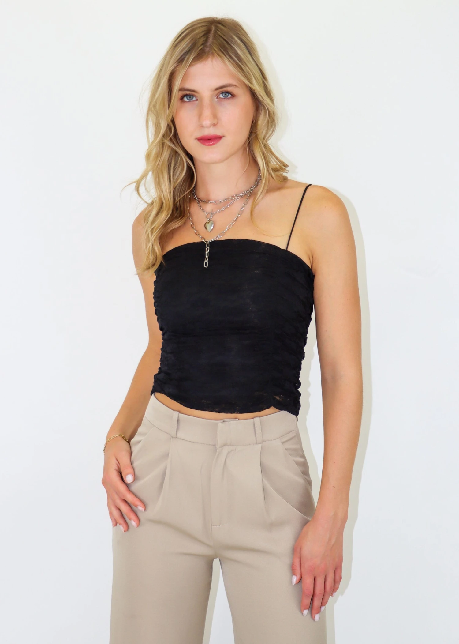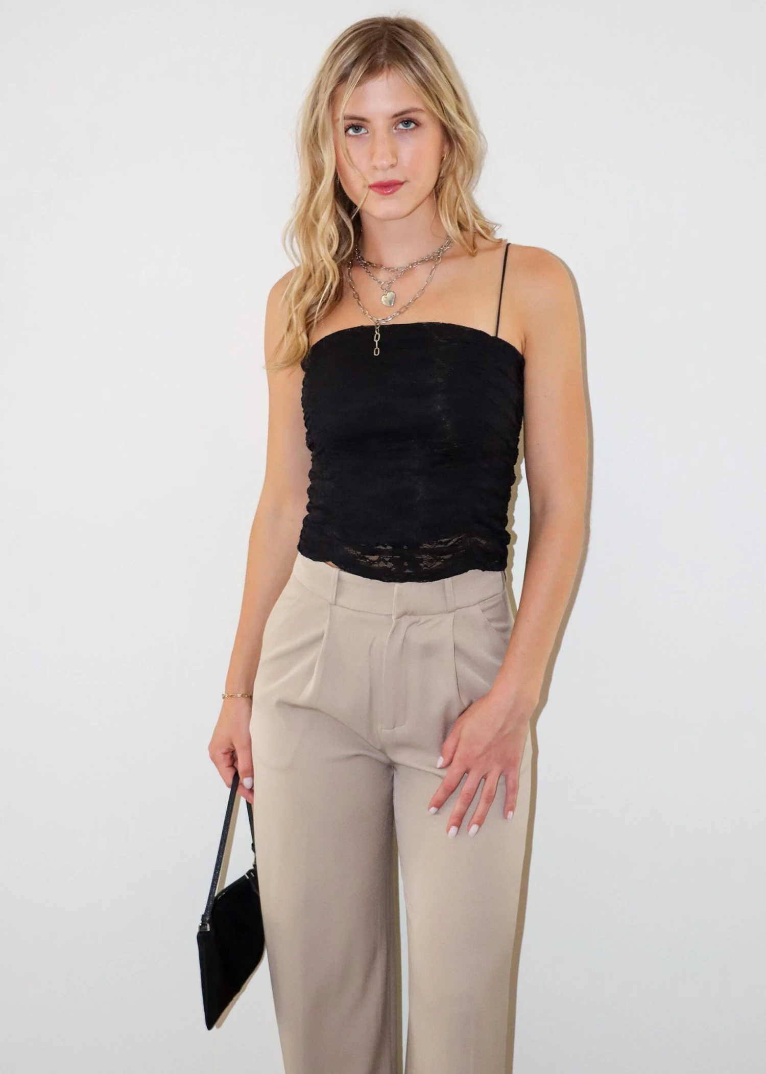 This lace tank is the perfect night out top! It is fully lined and features ruched details. Pair this with a pair of low rise pants flats for a trendy going out look.