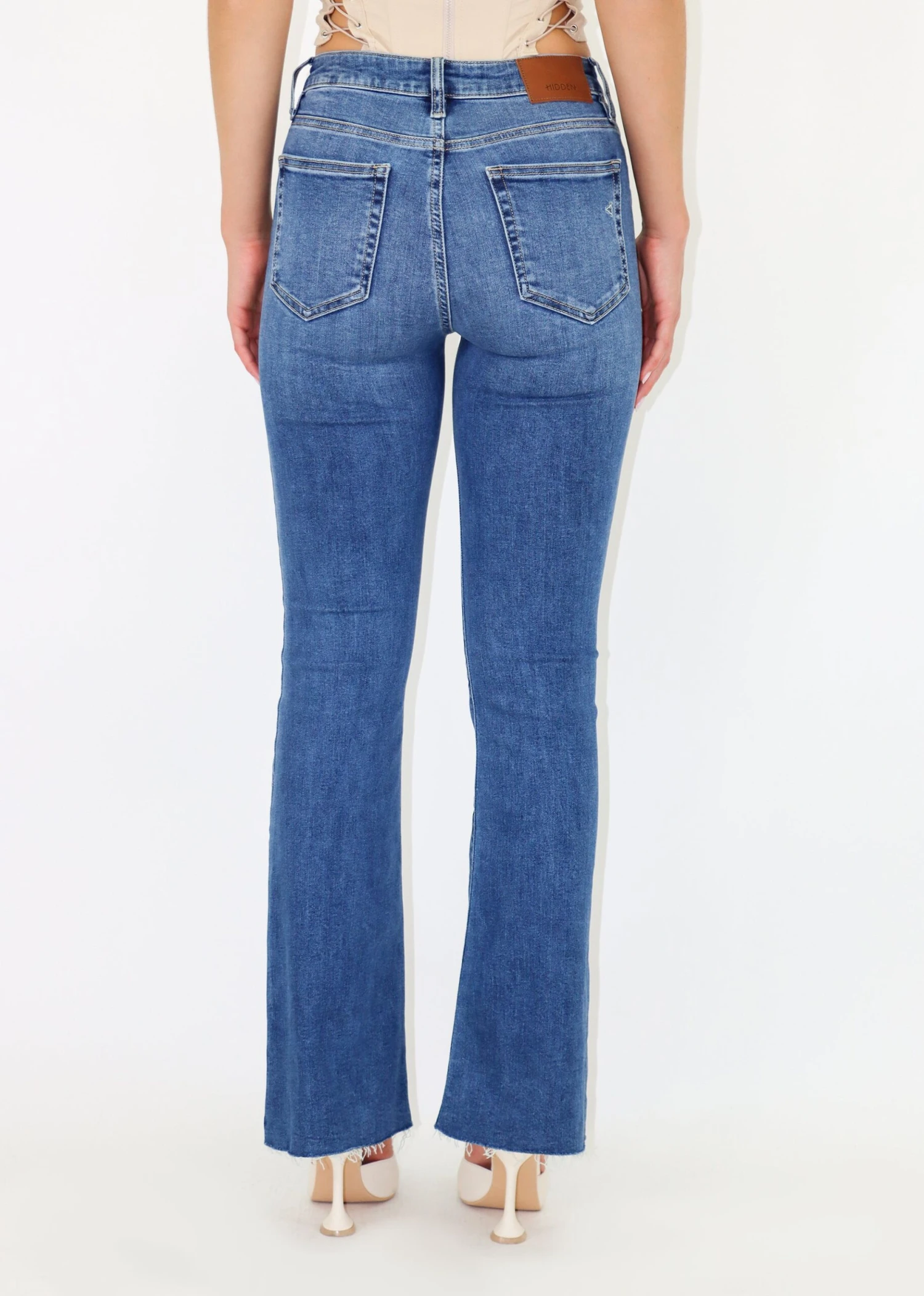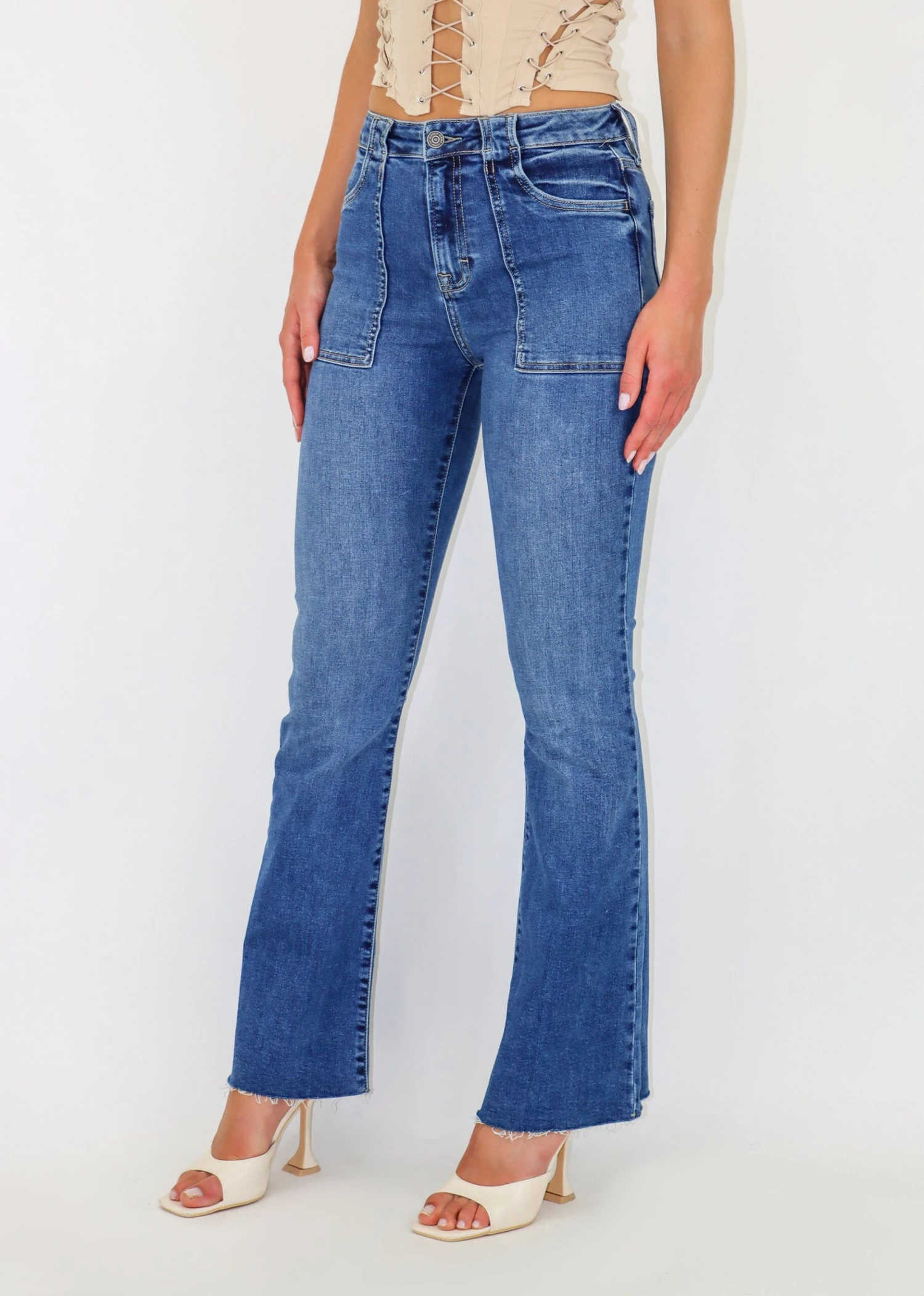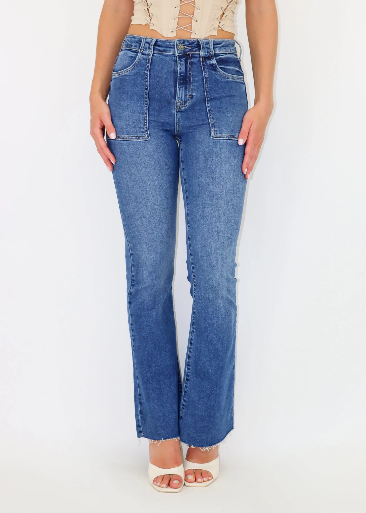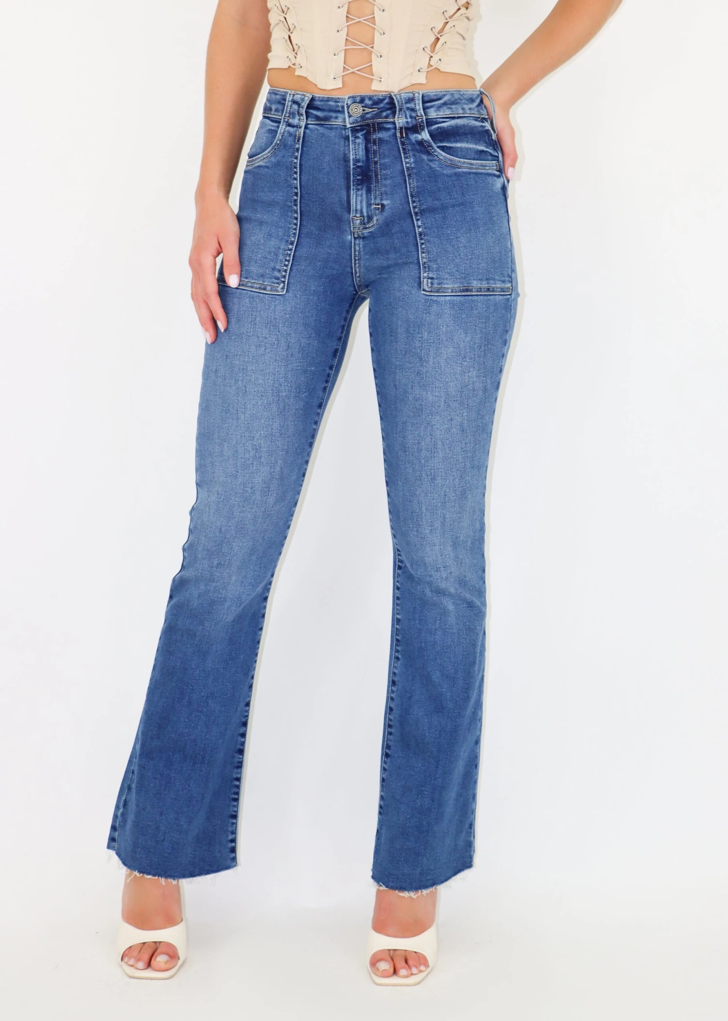These classic jeans are going to be a staple in your closet. They feature exposed pockets and a flare bottom that is so flattering. Pair them with an oversized sweater for a comfy casual look.