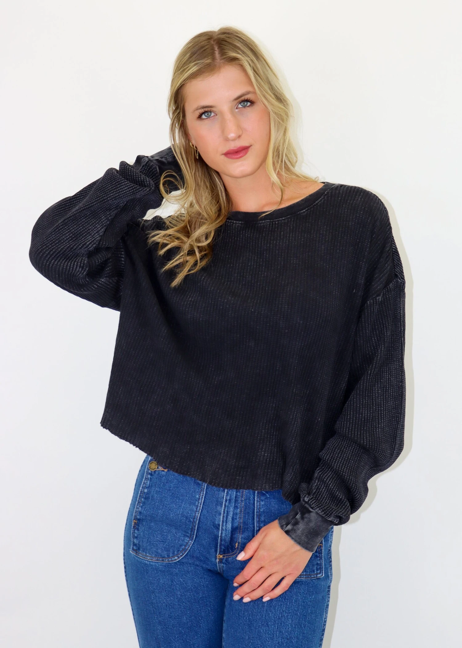 This cropped knitted long sleeve top is a must have! Featuring a cropped fit, and cut off hem detail. Wear on its own or layer with a jacket for a stylish look!
