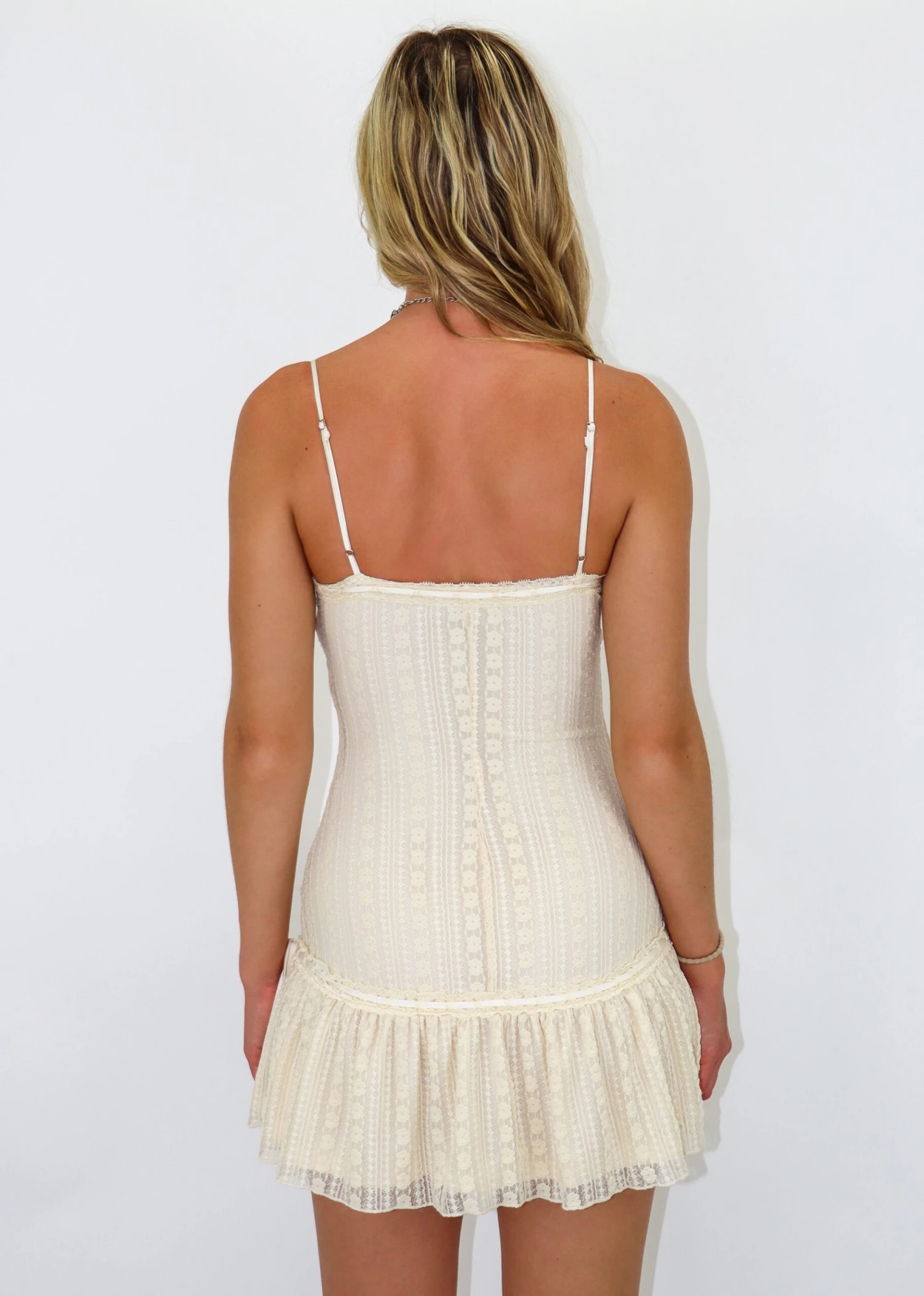 This ivory dress is the perfect statement piece to add to your dress collection! It features a drop waist peplum that looks flattering on anyone. The ribbon detail is so chic and we know you are going to look stunning in it!